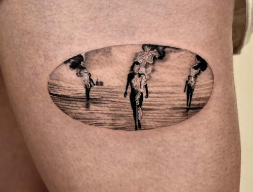 - Les silhouettes embrasées : comme dans certains tatouages artistiques, des corps traversés par la fumée ou le feu symbolisent la renaissance après l’épreuve. C’est le feu intérieur, celui qui consume pour mieux libérer.