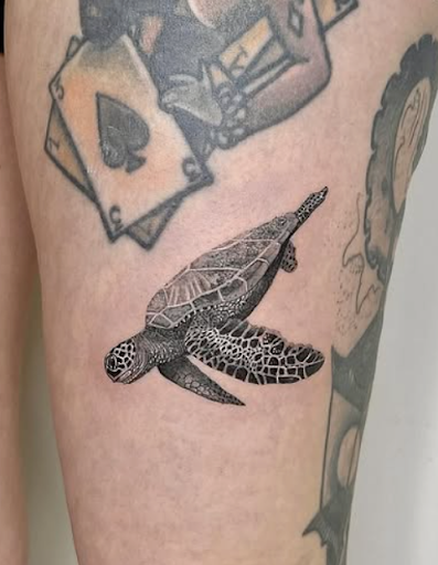 - La faune marine : tortues, baleines ou poissons deviennent des icônes de liberté et de sérénité. En microréalisme, la carapace d’une tortue ou les stries d’une baleine sont reproduites avec une minutie incroyable, donnant l’impression que l’animal se déplace sur la peau.