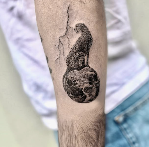 - La faune terrestre : un félin posé sur une sphère évoque la puissance et la majesté de la terre, dans un équilibre entre force brute et délicatesse du trait.